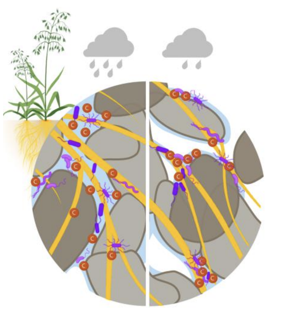 Check out our study on how reduced precipitation influence the translocation and microbial processing of living root-derived carbon – incorporating carbon stable isotope probing and solute transport modeling, we show that slightly reduced soil water may concentrate rhizodeposit carbon near roots, causing more diverse microbes to feed on it, and potentially influence soil carbon storage.