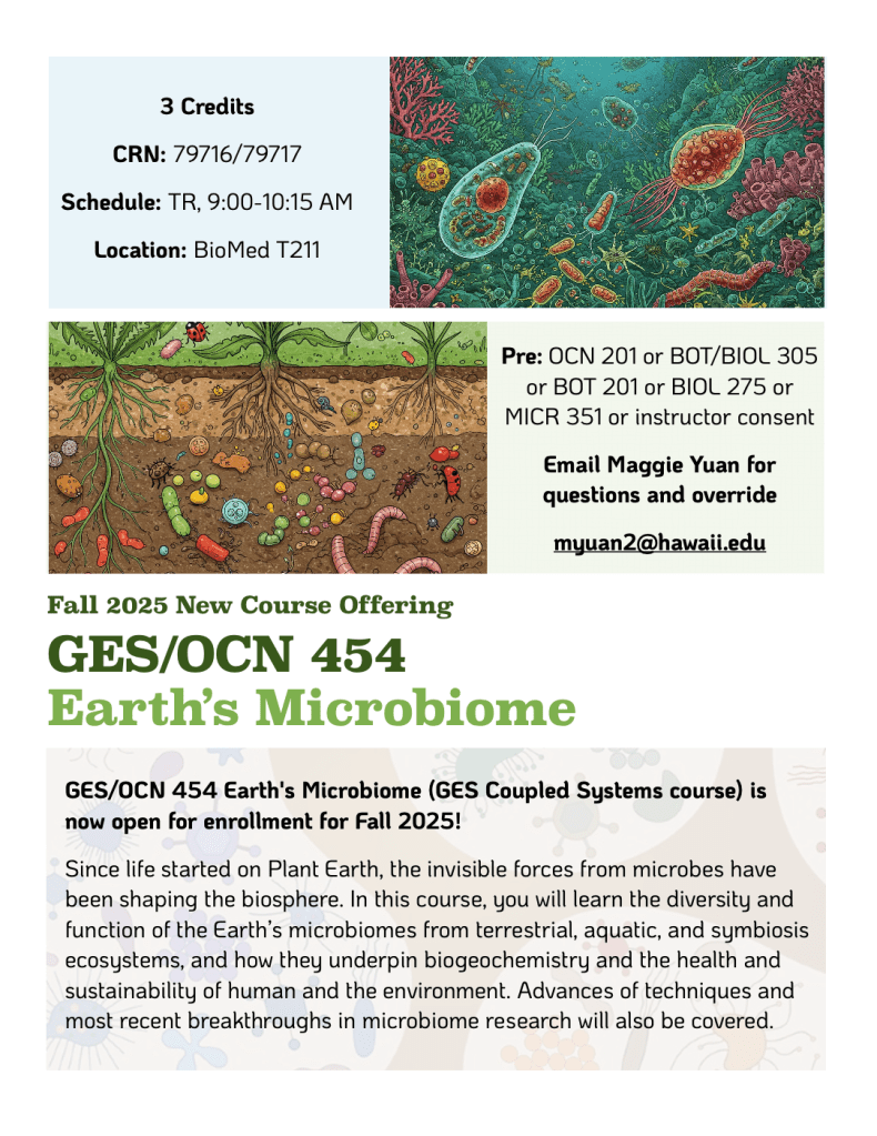 Teaching Enrollment is now open for: GES/OCN 454 Earth’s Microbiome for Fall 2025. See flyer or reach out for more information.